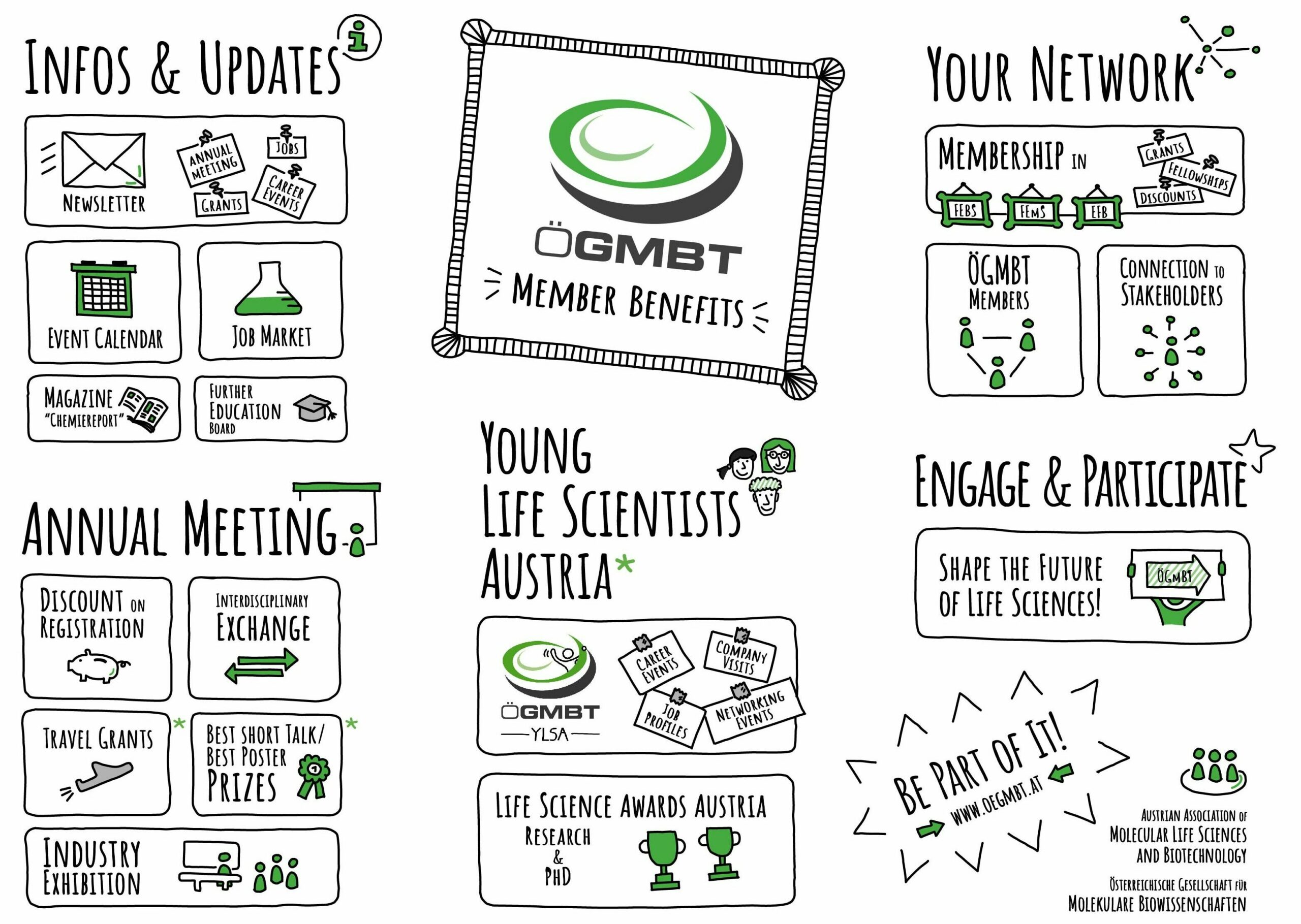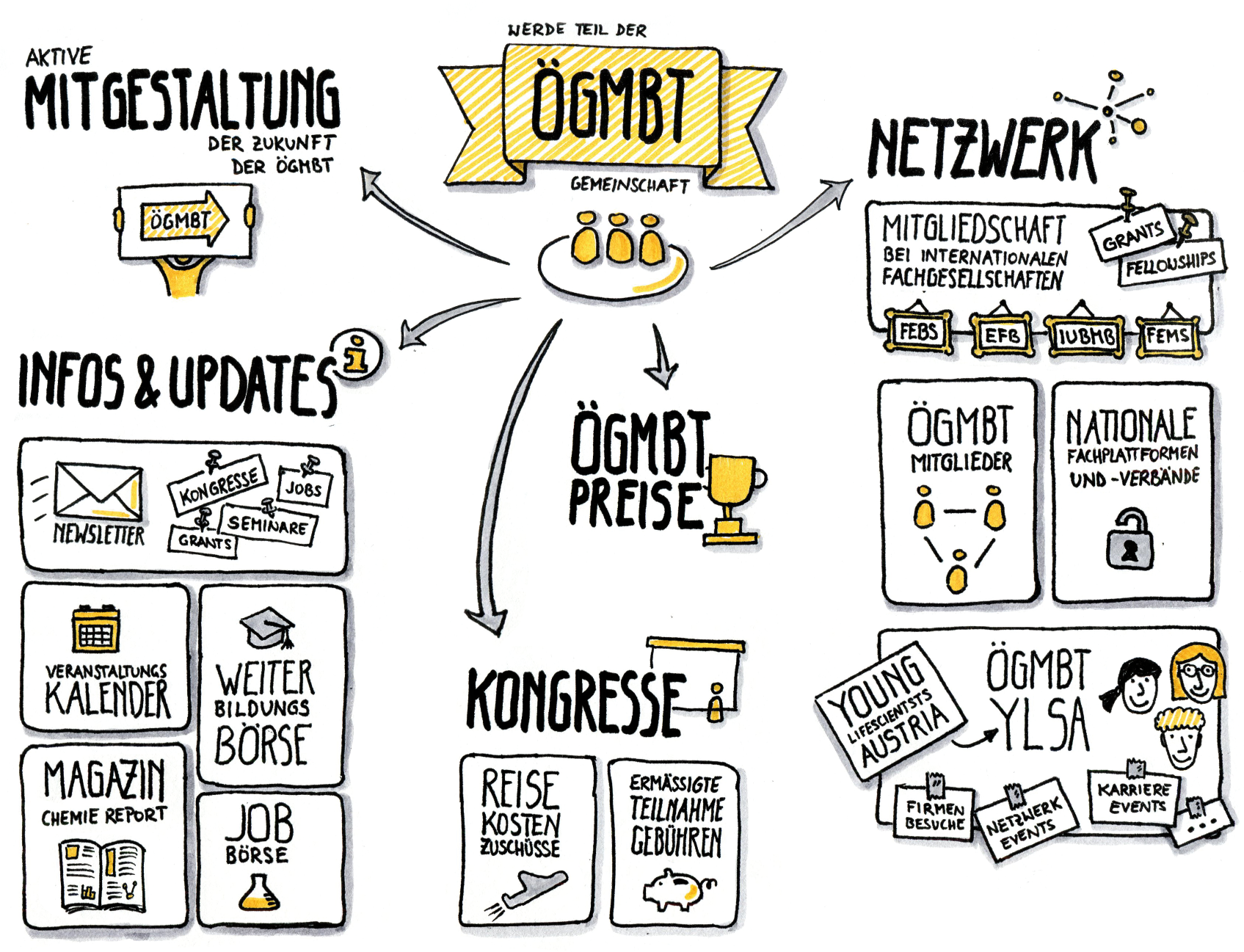 Sketchnote zur Werbung neuer Mitglieder für die Österreichische Gesellschaft für molekulare Biowissenschaften und Biotechnologie (ÖGMBT). Im Zuge dieser Arbeit wurde auch ein erweitertes Logo für die der ÖGMBT zugehörigen Young Life Scienctists Austria entwickelt.